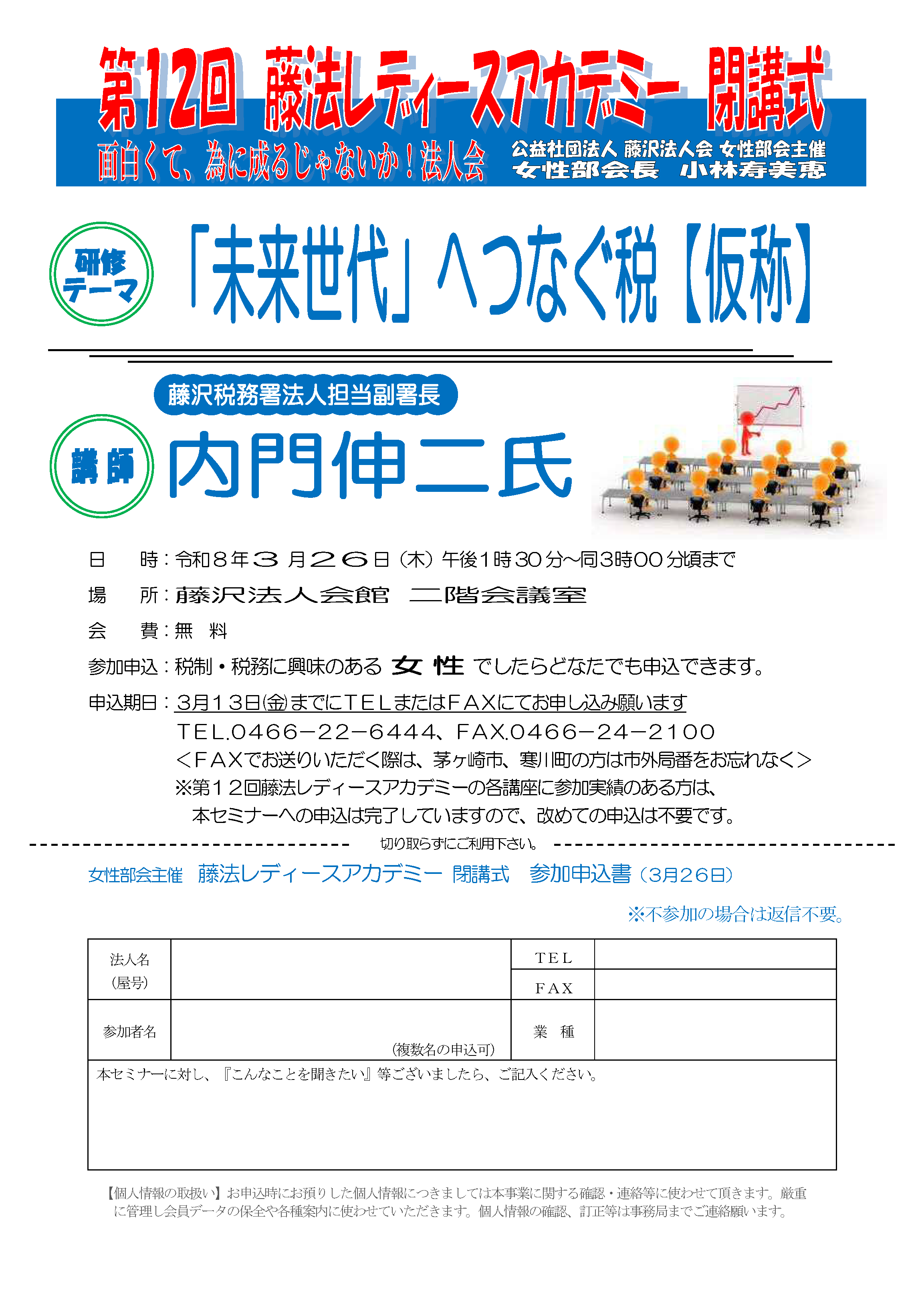 ※第12回藤法レディースアカデミーの各講座に参加実績のある方は、本セミナーへの申込は完了していますので、改めての申込は不要です。